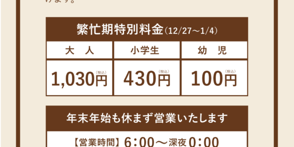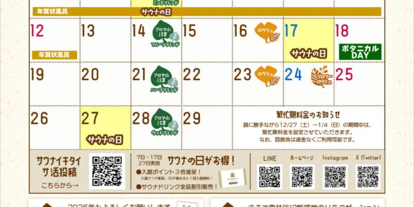 News ニュース TOP - ニュース・イベント 浴場に広告を出しませんか? SaunaTaloToyamaに広告を出しませんか! 昔ながらの銭湯で、鏡に描かれた広告を見たことはありませんか? SaunaTaloToyamaは富山市内だけでなく、県内外から年間10万人を超えるお客様が来店されます。 … 2026.1.16 【サウナイベント開催中🧖♨️】 サウナイベント開催中です🧖♨️🌟 【ブロワーロウリュ】【男性限定‼️】 第2・第4土曜日!開催いたします🔥✨ 【開催時間】🚹【男性】14:00~/17:00~ 計2回ずつとなっております! 参 … 2026.1.16 【ブロワーロウリュ開催✨】 ブロワーロウリュ【男性限定‼️】 第2・第4土曜日!開催いたします🔥✨ 【開催時間】🚹【男性】14;00~/17:00~ 計2回ずつとなっております! 参加無料・予約不要でございます🎶 &nb … 2026.1.8 【新年のご挨拶・年賀状風呂♨️🎍🌅】 新年あけましておめでとうございます🎍🌅 本年も【SaunaTaloToyama】をよろしくお願いいたします😌 本日も朝6時~夜24時まで営業しております! 初風呂、初サウナは是非、サウナタロト … 2026.1.1 SaunaTaloToyama✨1月イベントカレンダー✨ サウナタロトヤマ✨1月イベントカレンダー✨ 2026年もイベント盛りだくさんです🎊 年末年始も通常通り営業しております。 【年賀状風呂♨】 1/1(木)~1/12(日)開催いたします♪ 2026年もサウナタ … 2025.12.31 【期間限定】SEASONSHAKE~winter~⛄ 【期間限定】SEASON SHAKE ~winter~⛄ 冬限定のプレミアムシェイクが登場🧋✨ 🍫🍓いちごショコラシェイク🍓🍫 いちごのラテにチョコレートを合わせた冬のシェイク! いちごソースとナッツで風味 … 2025.12.28 【お年賀タオル🐎】 いつものタオルが、、、『お年賀タオル』に❕❕🐎 【数量限定】(1月1日(木)~なくなり次第) お値段そのまま新春気分♡ ※券売機でフェイスタオルのチケットをお買い求めください🎫 ※売り切れ次第通常のフェイス … 2025.12.25 【ボタニカルDay🍃】ウィスキング体験 SaunaTaloToyama×CoHoKa 【ボタニカルDay🍃】2026年1月18日(日) 【前回大好評❕】グループウィスキング体験✨✨ サウナの中でウィスキングやスクラブ体験などのプログラムを行います … 2025.12.18 繁忙期特別料金のお知らせ 年末年始も6:00~24:00まで休まず営業します♨ ※12/27(土)~1/4(日)繁忙期特別料金となりますが、 回数券は追加料金なくご利用いただけます。 そして元旦からは! 数量限定でお年賀フェイスタオ … 2025.12.17 第22回「サ禅」受付開始! 【大好評の「サ禅」イベント受付開始‼】 サウナと禅を掛け合わせた究極の「ととのい」を体験しませんか?🧘♂️🔥 富山市最勝寺の和尚様による坐禅で、心身ともにリフレッシュ! 森林浴のような香りや、坐禅用サウナクッション「Z … 2025.12.7 12345...10...»