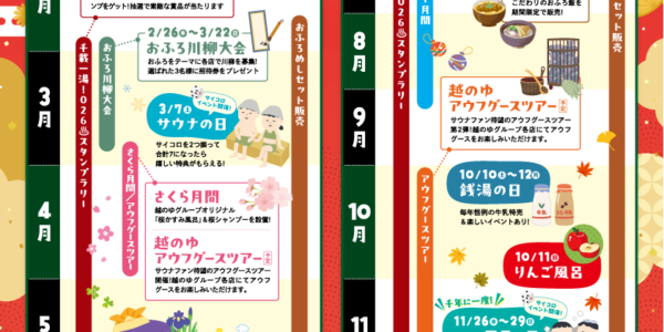 News ニュース TOP - ニュース・イベント 【ボタニカルDay🍀】グループウィスキング体験✨ SaunaTaloToya×CoHoKa 【ボタニカルDay🍀】2026年3月15日(日) 【要予約‼️】グループウィスキング体験✨ サウナの中でウィスキングやスクラブ体験などのプログラムを行 … 2026.3.3 3月7日は【サウナの日🧖】サイコロイベント開催‼️ 3月7日は【サウナの日🧖】✨✨ サイコロ🎲イベント開催いたします‼️ サイコロを2つ振って出た目の合計が『❼』なら入浴ポイント❼p進呈‼️ ハズレても➌p当たる‼️ 当日限定でイオンウォーター … 2026.3.1 【3月イベントカレンダー✨】 サウナタロトヤマ✨3月イベントカレンダー✨ 3月もイベント盛りだくさんです🎶 【📍koritori新スタッフ(経験者)お試しキャンペーン✨】 期間:3/1~6/30 延長10分無料サービス‼️ 30分以上の … 2026.2.28 いよいよスタート‼️【千載一湯026スタンプラリー】✨ いよいよスタート‼️ 全国の参加温浴施設をめぐる【千載一湯026スタンプラリー】‼️ 店頭のQRコードを読み込んでチェックイン🎵 5店舗訪問で1回応募可能。 リファの高級ドライヤーなど素敵な景 … 2026.2.26 浴場に広告を出しませんか? SaunaTaloToyamaに広告を出しませんか! 昔ながらの銭湯で、鏡に描かれた広告を見たことはありませんか? SaunaTaloToyamaは富山市内だけでなく、県内外から年間10万人を超えるお客様が来店されます。 … 2026.2.21 【koritori】からのお知らせ🍀新スタッフお試しキャンペーン✨ 🍀【koritori】からのお知らせ🍀 koritoriに新スタッフが仲間入り🌟 新スタッフ(経験者)お試しキャンペーン! 30分以上のコース 10分延長‼️ 【実施期間】2026年3月1日( … 2026.2.21 【千年に一度の026(おふろ)の年‼️】 【千年に一度の026(おふろ)の年‼️】 おふろの年✨イベントインフォメーション💁♀️ 2026年は千年に一度のおふろ(026)の年。 越のゆグループではこの特別な一年を通して、 おふろの楽しさ・気持ちよ … 2026.2.18 期間限定の「サ氷」販売開始 新しい「サ氷」🧊、4月末までの期間限定で販売中です✨✨ 【みかんミルクとしゅわポ】 みかんソース🍊とみかんミルクソース🍊が甘酸っぱい美味しさ! 【さくらイチゴ】 いちごミルク🍓と桜ソース🌸それぞれ異なる味わいが楽しめ … 2026.2.5 【2月イベントカレンダー✨】 サウナタロトヤマ✨2月イベントカレンダー✨ 【📍アウフグースイベント】ほかほかさん来店! 2/15(日) 南砺市を中心に活動している熱波師『ほかほか』さんが サウナタロに初来店‼️‼️参加無料です🎶 【男湯 … 2026.1.28 【ほかほかさんのアウフグースイベント開催‼️】 【ほかほかさんのアウフグースイベント開催‼️】 南砺市を中心に活動する熱波師ほかほか@hoka_hoka_27 さんのアウフグースイベント💨を2/15(日)に開催します✨✨ ほかほかさんはサウナタロトヤマでは初めてアウフ … 2026.1.21 12345...10...»