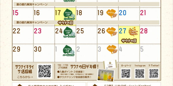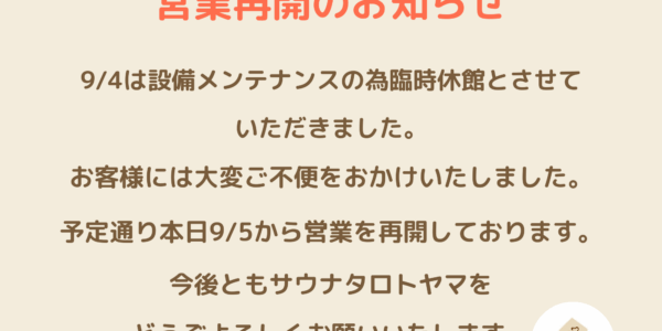 News ニュース TOP - ニュース・イベント 【新発売】SaunaTaIoToyama×SAUNAJUNKIES コラボ商品🔥 SaunaTaloToyama×SAUNAJUNKIES コラボ商品が登場🔥 パンク×サウナのミクスチャーデザインで人気のSAUNAJUNKIESさんとのコラボ! サウナタロトヤマのトントゥをパンキッシュにデザインしてい … 2025.10.2 2025年10月カレンダー 10月のSaunaTaloToyamaはこちら! ●10/10(金)は銭湯の日! 銭湯の日イベントとして、サイコロチャレンジを実施いたします! サイコロを振って、「2」と「6」が同時に出たらその日の入浴ポイントが【5P】 … 2025.10.1 【秋の新メニュー🍁】 大人気! ・カキフライプレート こちら単品もお選びいただけます✨ サクッと揚がった ・九頭竜舞茸天氷見うどん 冷や・かけどちらもおすすめです🌟 プレミアムシリーズ新フレーバー🍹 ・キャラメルア … 2025.9.26 ブロワーロウリュ延期のお知らせ 誠に残念ではございますが、 9月イベント【ブロワーロウリュ】開催を予定しておりましたが、 開催を延期させていただくこととなりました。 9/27(土)は団扇ロウリュに変更になります。 10月以降に関しましてもブロワーロウリ … 2025.9.18 男性ドライサウナ利用再開のお知らせ 男性ドライサウナ タイル張り替え作業がおわり、乾燥終わり次第、 本日16時より、利用再開予定でございます。 大変ご迷惑をお掛けしたことをお詫び申し上げます。 皆様のご利用をお待ちしております。 2025.9.17 リラクゼーションサロンkoritoriにて10分延長無料のキャンペーンを実施 人気のリラクゼーションサロンkoritoriにて10分延長無料のキャンペーンを実施✨ 9/6(土)~9/21(日)の期間限定で、60分以上のコースご利用の方は10分延長のサービス!😍🎉 ご予約はお電話、またはフロントにお … 2025.9.6 ブロワーロウリュ開催のお知らせ 9月よりスタート【男性限定】 第2・第4土曜日!ブロワーロウリュ開催いたします 【開催時間】14:00〜/17:00〜 計2回ずつとなっております! 参加無料・予約不要でございます たくさんのご参加お待ちしております 2025.9.5 営業再開のお知らせ 2025.9.5 9月のイベントカレンダー サウナタロトヤマ✨9月イベントカレンダー✨ 9月もイベント盛りだくさんです!☺️ 【毎週金曜日】ロウリュサービス‼️ ・男湯…18:00/20:00 ・女湯…17:30/19:30 【毎週水曜日】アロマ水設置‼️ … 2025.9.3 【臨時休館のお知らせ】 9月4日(木) 設備メンテナンスのため、臨時休館とさせていただきます。 翌日9月5日(金)は通常通り営業予定です。 2025.8.20 12345...10...»