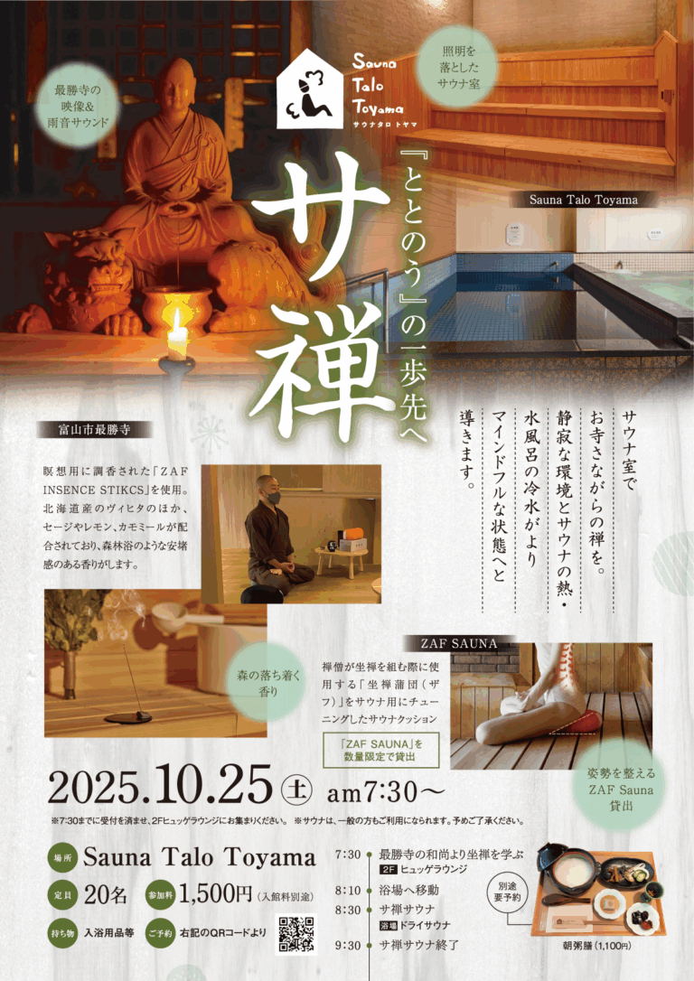 ニュース・イベント TOP - ニュース・イベント - 【サ禅】予約受付開始しました‼️ 【サ禅】予約受付開始しました‼️ 【サ禅】予約受付開始しました‼️ 🔥開催日時🔥 2025 10月25日(土)朝7:30〜 定員20名 🍚特製 朝粥膳🍚 定員5名さま限定でご用意いたします! 詳細・ご予約は下記URLから💁 https://forms.gle/7Sn7HeTK8nhsAu5Q8 関連するお知らせ・イベント 3/13(月)の【半日休館】について。 【北陸アウフグースツアー中止のお知らせ】 お客様へのアンケート実施について 6/5(木)午後のレストラン利用停止について