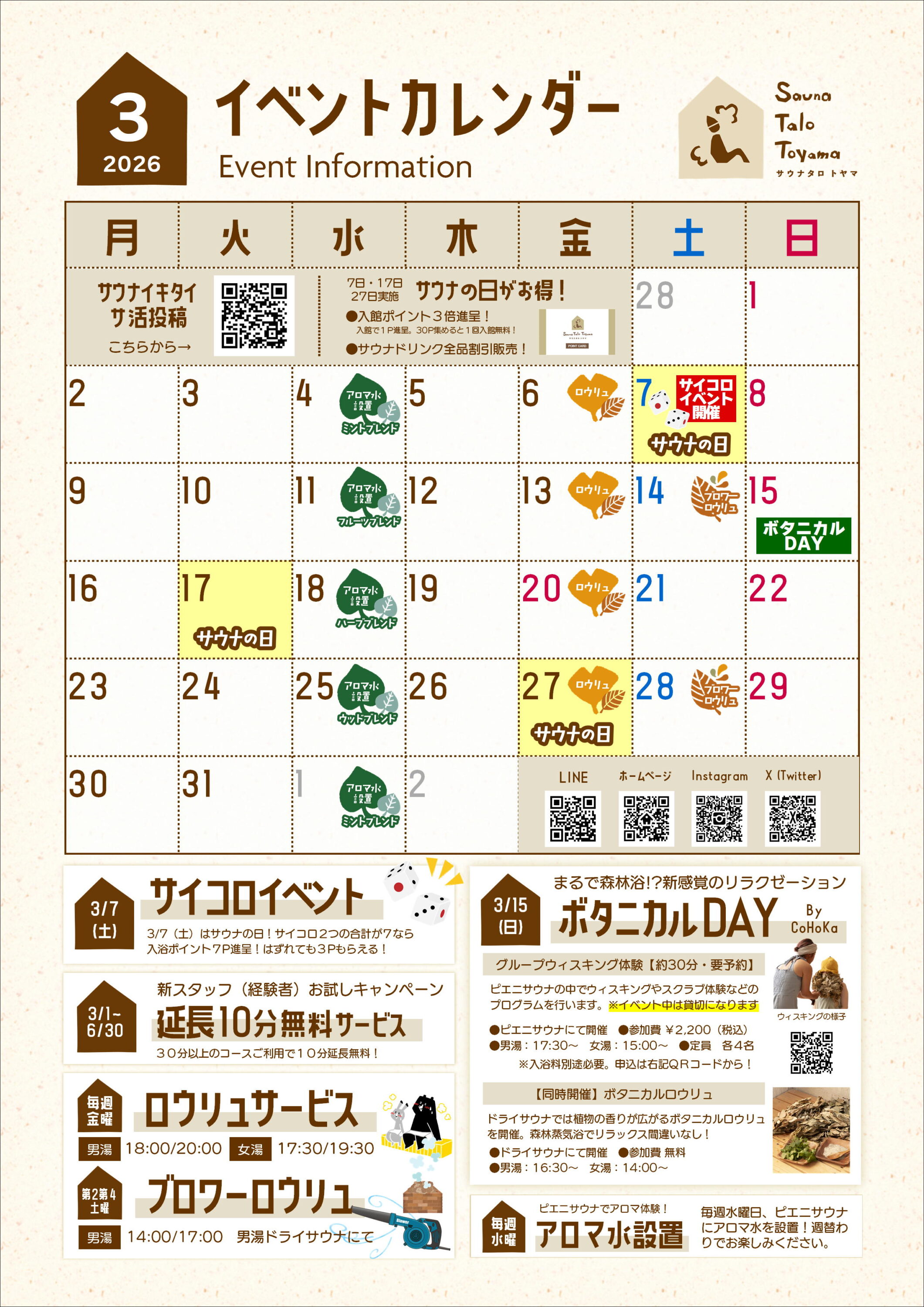 サウナタロトヤマ✨3月イベントカレンダー✨