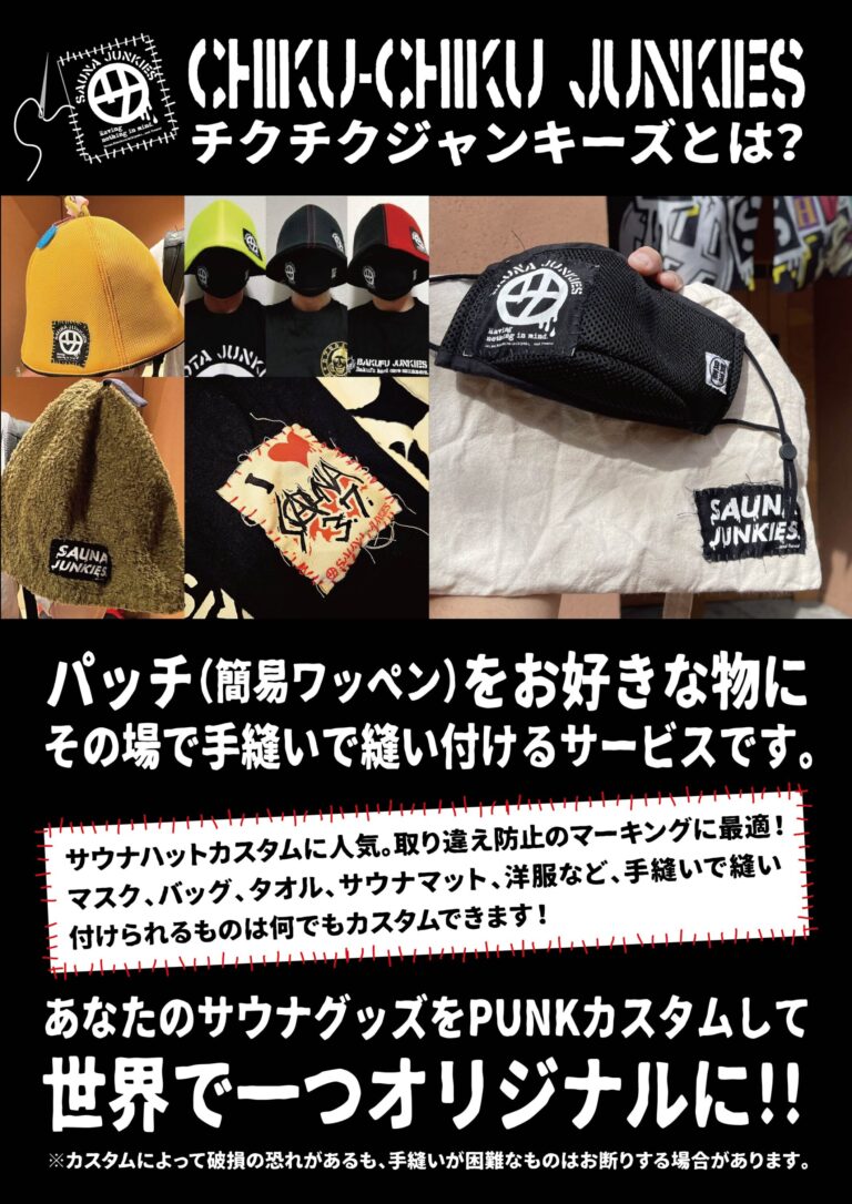 ニュース・イベント TOP - ニュース・イベント - チクチクジャンキーズのお知らせ🔥 チクチクジャンキーズのお知らせ🔥 12/21(日)13時~18時にパッチ🧵(ワッペン)の縫い付けサービスを実施致します。 サウナハット・バッグ・タオル・洋服など、手縫いで縫い付けられる商品が対象となります😊 この日限定のパッチも販売予定! ぜひオリジナルグッズにカスタマイズしてみて下さい!👍 関連するお知らせ・イベント 第5弾・冬のサ禅開催します。 【年末年始】営業・料金のお知らせ ととのうサウナ飯&麺 第18回 サ禅 参加受付開始しました