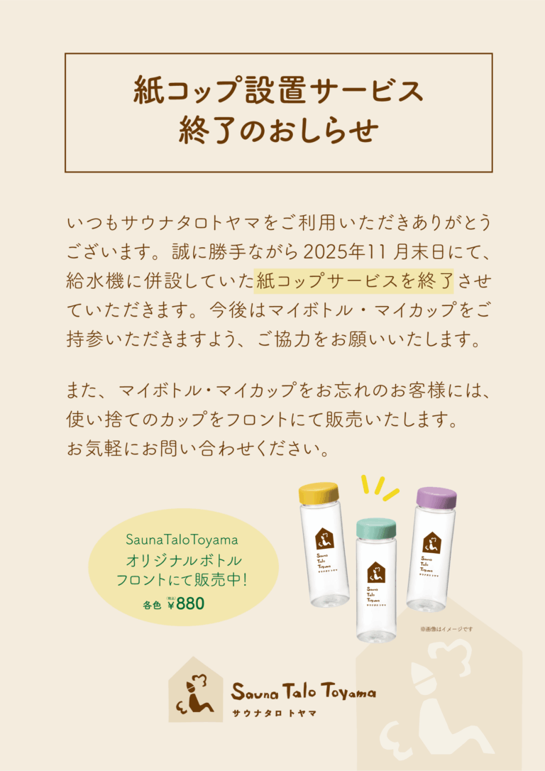 誠に勝手ながら2025年11月末日にて、給水機に併設していた紙コップサービスを