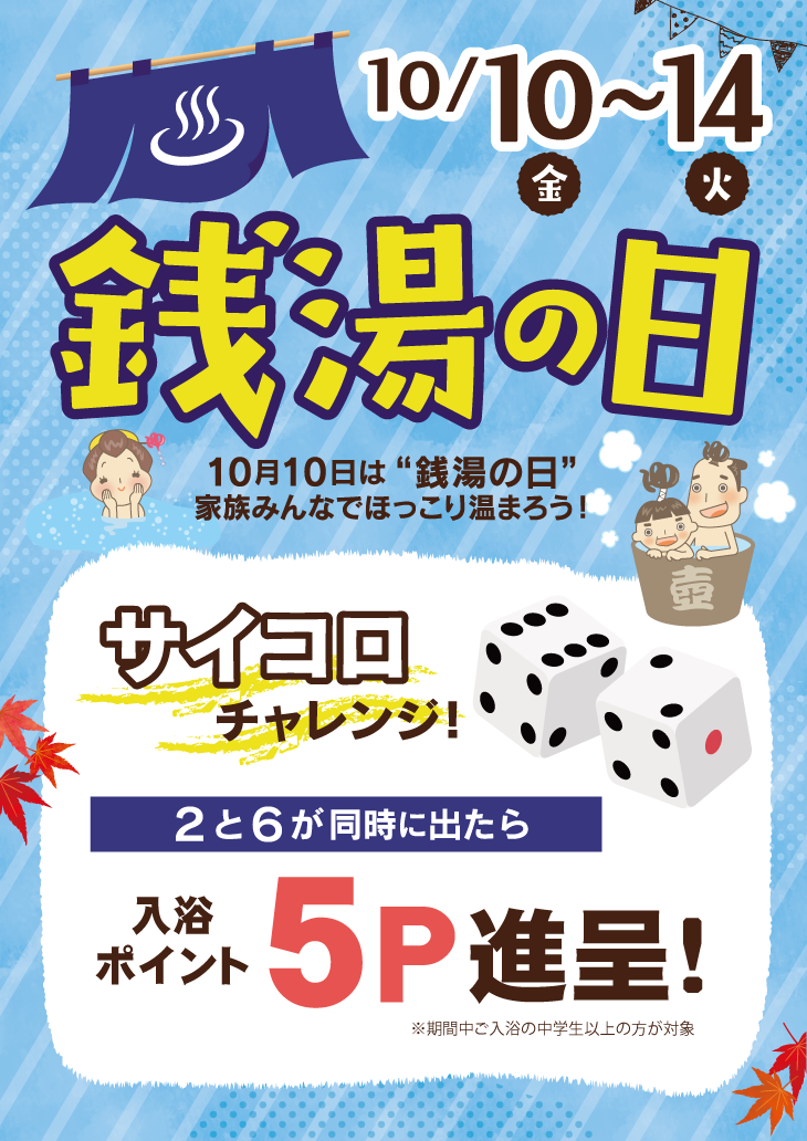 ニュース・イベント TOP - ニュース・イベント - 10月10日は銭湯の日! 10月10日は銭湯の日! サイコロふって入浴ポイントゲットしよう! 10/10(金)~10/14(火)は銭湯の日イベントを開催! サイコロを2つ振って「2」「6」がそろった方は、なんと入浴ポイントが5pになっちゃう! 運試しとしてぜひチャレンジしてみてね~!! 関連するお知らせ・イベント B浴ピエニサウナ 利用再開のお知らせ 第9回サ禅 内容が新しくなりました! レモン風呂イベント開催 新年あけましておめでとうございます